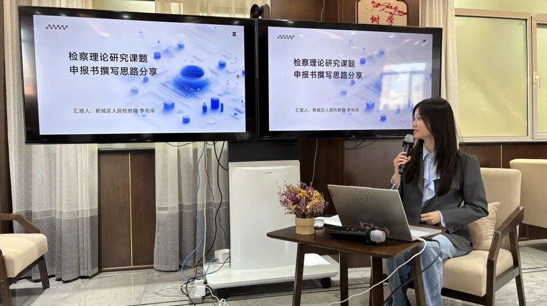 活动中,新城区人民检察院第四检察部李尚华的分享分为课题选择、综述编写、研究内容三个方面,课题选择方面,李尚华向大家分享了自己搜集到的选题标准以及课题论证的参考架构,在综述编写方面介绍了她自己的行文思路,研究内容方面谈了自己对优秀文章标准的看法,即逻辑清晰、观点明确、方法可视;新城区人民检察院第二检察部李嘉辉则和大家谈了自己在课题申请及撰写的经历,结合自己的认识分享了一些在撰写方面需要注意的问题;赛罕区人民检察院武楚霓结合自身实践经验,在突出创新价值等方面分享了心得,三位同志的分享强调了选题应紧扣检察实务前沿与理论发展动态,力求“小切口、深挖掘”。