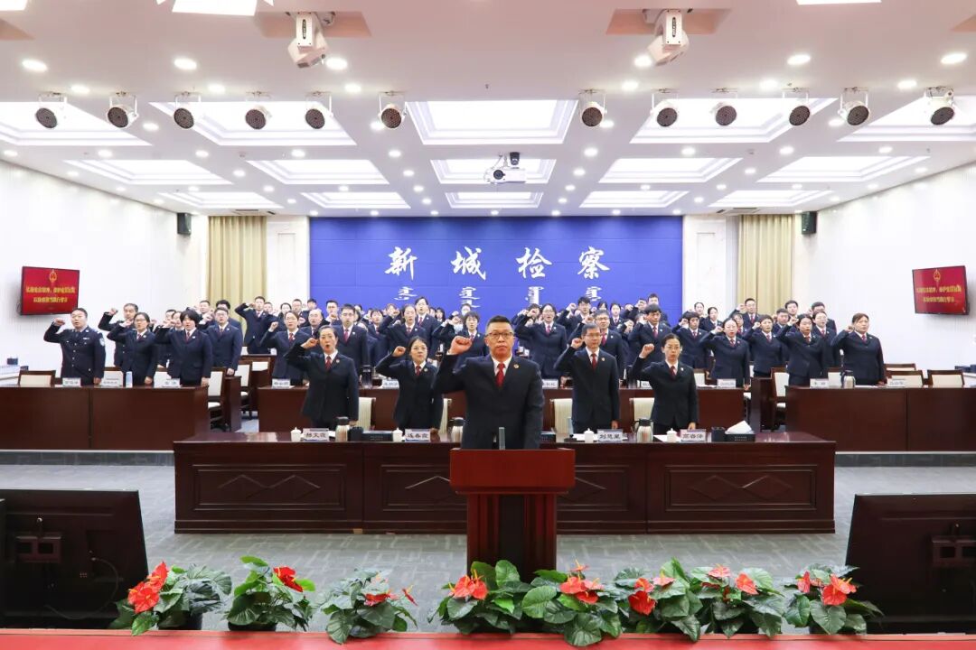为深入学习贯彻习近平法治思想,教育和引导全体检察人员忠于宪法、遵守宪法、维护宪法,依法履行检察职责,12月4日上午,在第十二个国家宪法日,呼和浩特市新城区人民检察院举行“弘扬宪法精神,维护宪法权威,以检察担当践行誓言”宪法宣誓活动。院党组书记、代检察长吴铁刚领誓并讲话,党组副书记、副检察长刘慧星主持,全体检察人员参加。