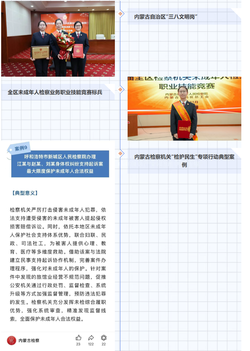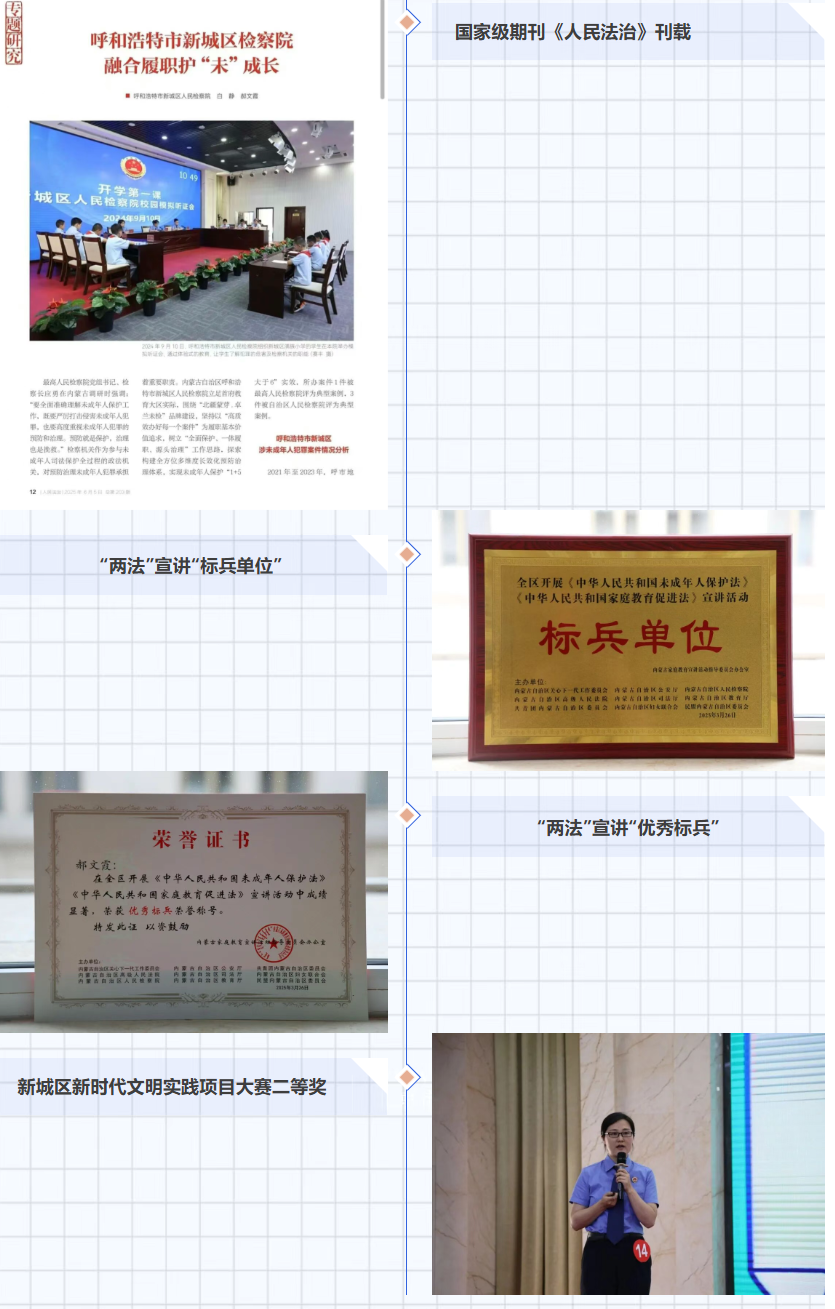 2025年“好阿姨”团队获评内蒙古自治区“三八文明岗”,1名同志在全区未成年人检察业务职业技能竞赛中获得“业务标兵”称号,2个案例分别获评内蒙古自治区级、呼和浩特市级典型案例,1份涉未一审公诉起诉书、1份涉未行政公益诉讼检察建议书获评自治区级优秀法律文书,1篇理论研究成果被国家级期刊《人民法治》刊载,开展《家庭教育促进法》《未成年人保护法》宣讲活动被内蒙古青少年普法教育委员会授予“标兵单位”、“优秀标兵”荣誉称号,“好阿姨”护苗工程获新城区新时代文明实践项目大赛二等奖。