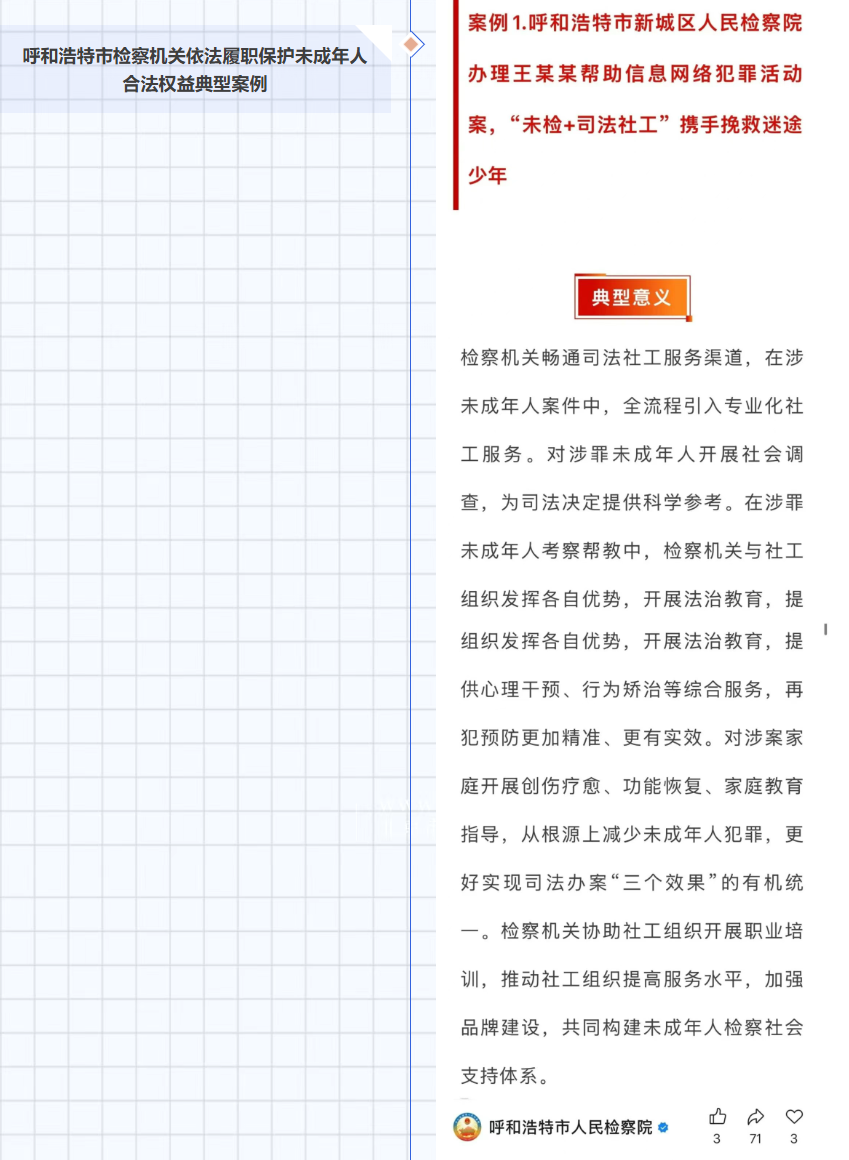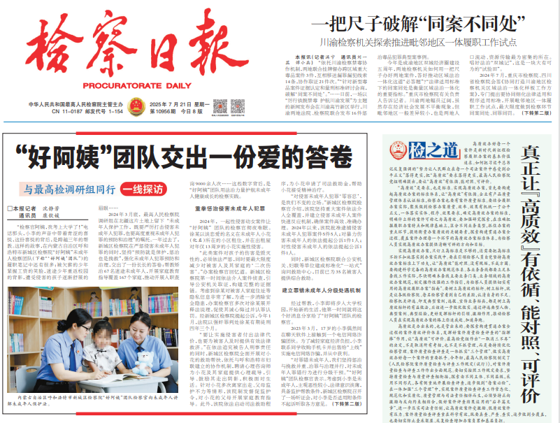 以党建促业务。基于我院未检工作成效与经验做法,中共新城区委政法委于2024年12月在我院打造“好阿姨”团队党建品牌,团队由郝文霞专委、蒙汉双语检察人员格根托亚及年轻检察官助理艾丽雅组成,依托各项检察职能,尽最大努力为孩子们提供最多的法律保护。工作开展情况由呼和浩特市政法委作为“政法先锋”进行专题宣传报道,《检察日报》以《“好阿姨”团队交出一份爱的答卷》为题在2025年7月21日头版头条报道,《检察日报》2025年8月14日未来周刊以《从“可选项”到“必答题”:司法社工“进阶”之路》为题对我院青少年社工帮教工作进行专题报道。