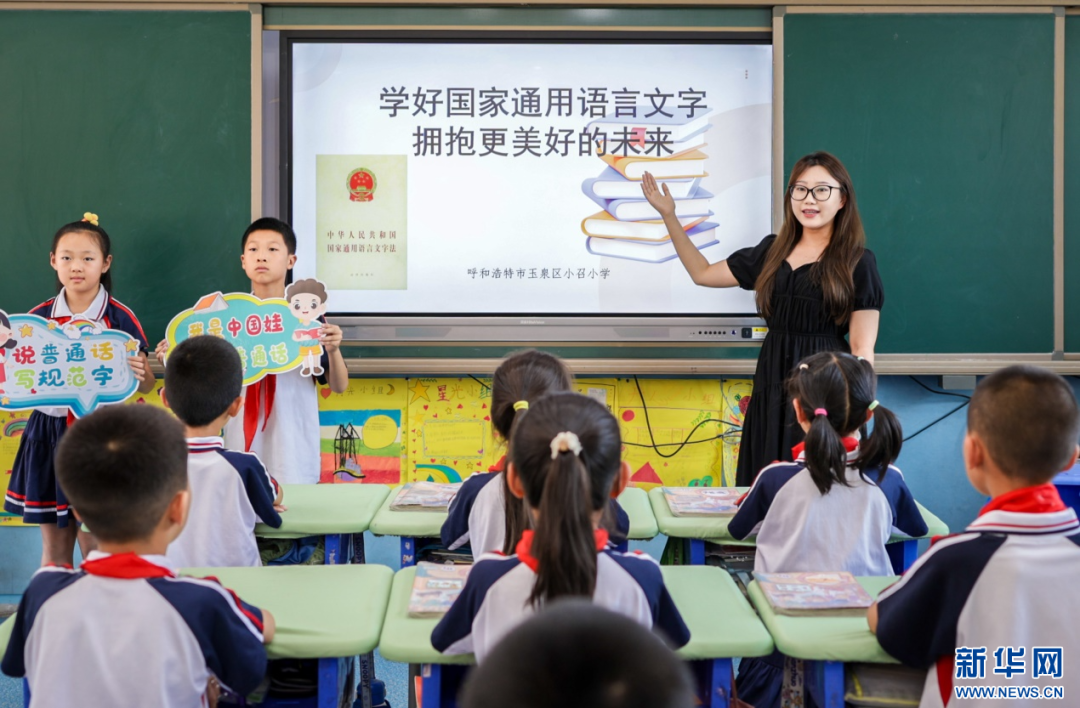 ▲6月23日,内蒙古呼和浩特市玉泉区小召小学老师在班会上为学生讲解《中华人民共和国国家通用语言文字法》相关知识。新华网发(丁根厚 摄)