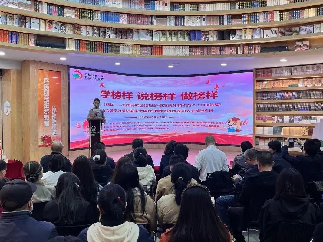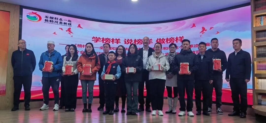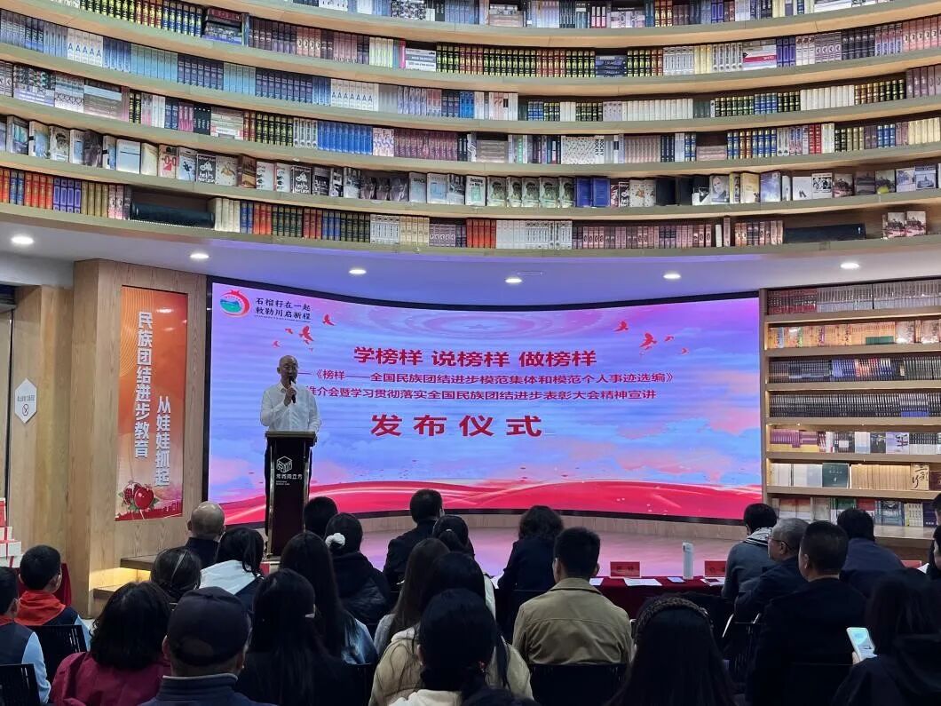 随后的“学榜样——图书捐赠仪式”上,现场向企事业单位、社区、学校捐赠《榜样——全国民族团结进步模范集体和模范个人事迹选编》等书籍,以润物细无声的方式宣传民族团结进步模范的精神和事迹。