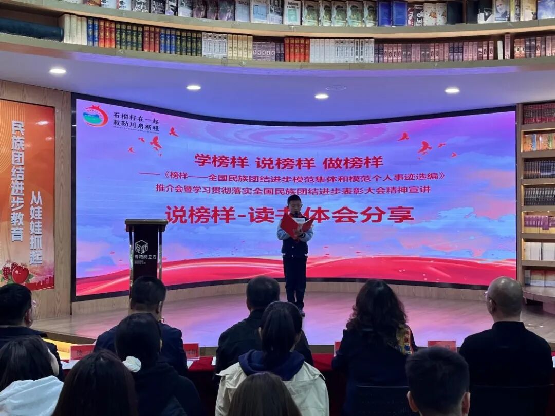 “说榜样——读书体会分享”环节中,来自落凤街小学的学生代表、民族学院的青年代表和河西社区的群众代表围绕《榜样——全国民族团结进步模范集体和模范个人事迹选编》畅谈感悟,从不同视角解读模范精神。现场交流氛围热烈,切实推动“说榜样、学榜样”转化为“做榜样”的实际行动。